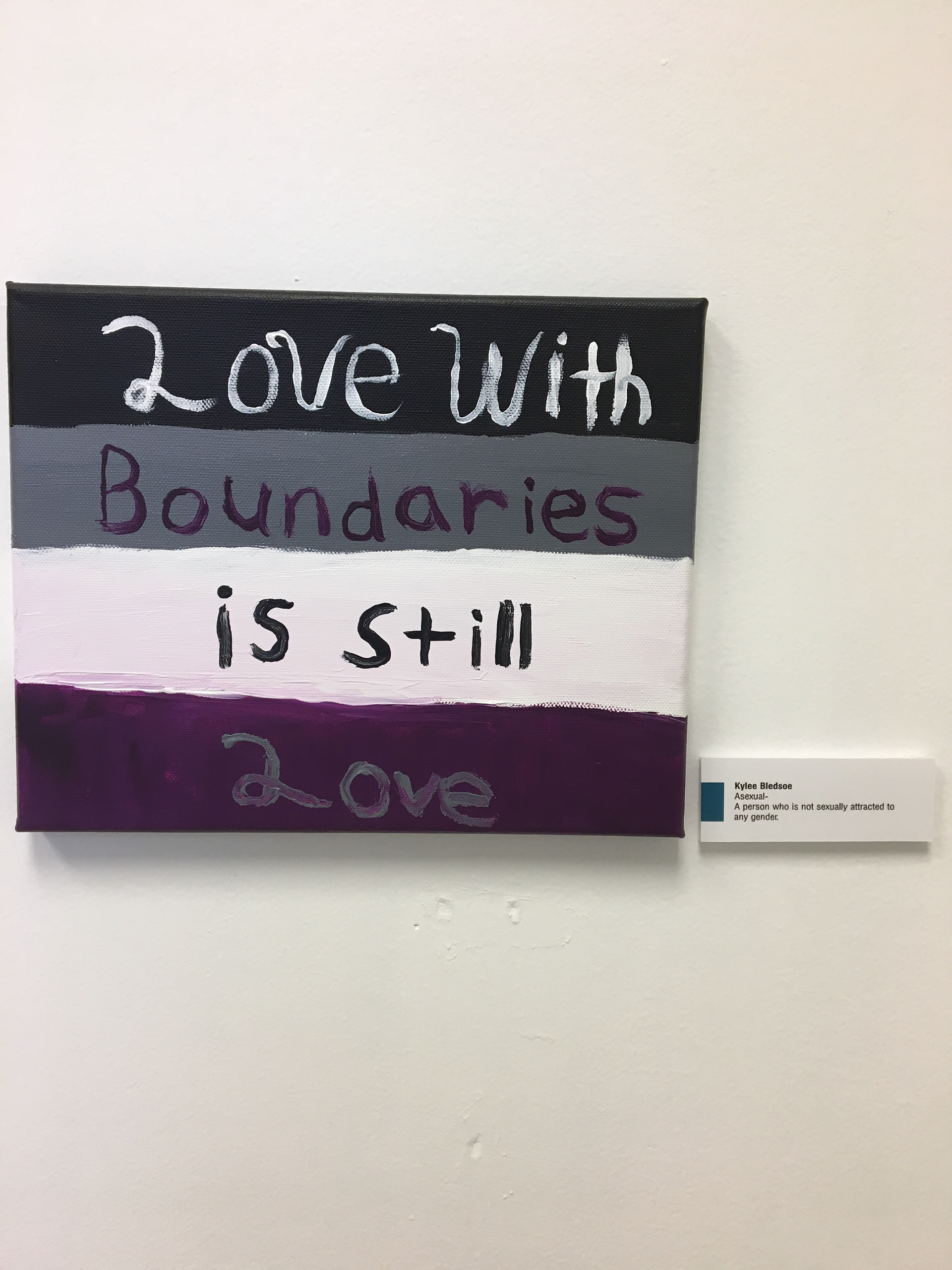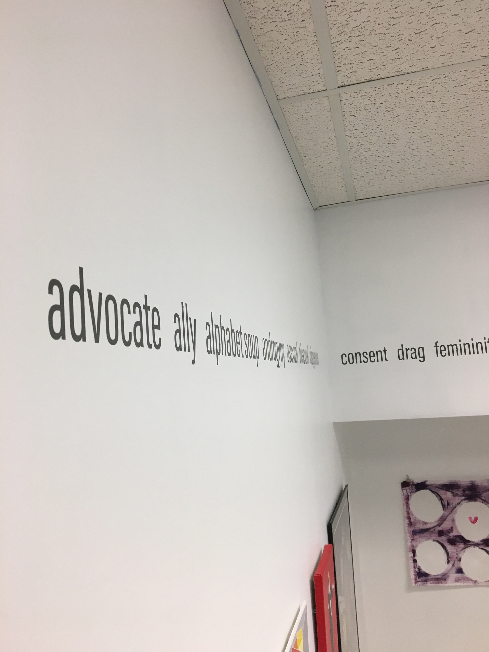 The art in this show has been created by artists of sexual and gender minorities and their allies to visually represent their interpretation of words used in the LGBTQIA+ community. Each of these pieces were created in an effort to communicate and educate the accurate definitions for individuals outside of the LGBTQIA+ community to have a better understanding of their meaning. Often words or phrases are used in combination with the LGBTQIA+ community that others are unfamiliar with. This exhibition offers both visual and written descriptions of some of the most common words in order to open a dialogue, nurture an understanding of different viewpoints, and foster inclusiveness.